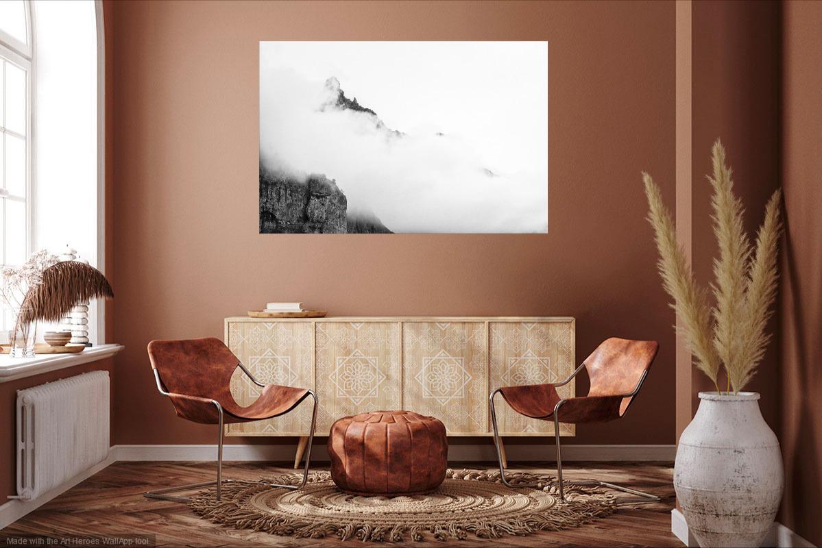 Il ne manquait plus que l’inspiration… Je n’ai finalement gardé qu’une seule photo de cette sortie. Sans les couleurs ! D’autres images de la sortie me plaisaient, mais celle-ci m’a particulièrement séduite par son minimalisme. Les brumes masquent presque entièrement la montagne, ne laissant apparaitre qu’un fragment de falaise et la ligne de crête vers le sommet. J’ai choisi de la traiter dans un noir et blanc assez dur. Je souhaitais renforcer ce contraste entre le noir de la montagne et le blanc des brumes.