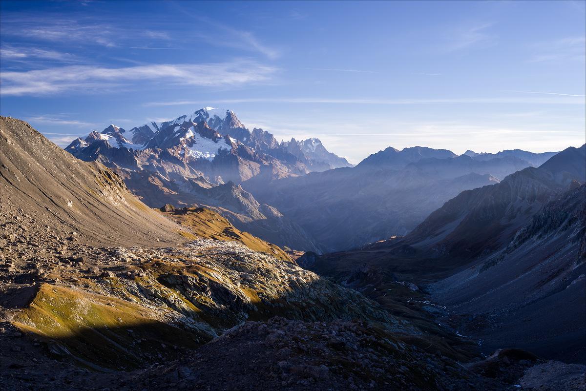 Mais comme j’aime bien emprunter de nouveaux sentiers, j’avais cette fois-ci voulu arriver par le col, plutôt que remonter (longuement) la vallée. J’avais peut-être aussi envie d’épater ma compagne, avec une vue à couper le souffle en débouchant au col. Le souffle coupé, elle l’a eu, autant par le dénivelée que par les pentes raides qui l’ont un peu stressée… Mais le lendemain matin, sur le chemin du retour, l’ombre et la lumière dans la vallée, le soleil rasant sur le massif du Mont Blanc, l’avaient récompensé pour ses efforts.