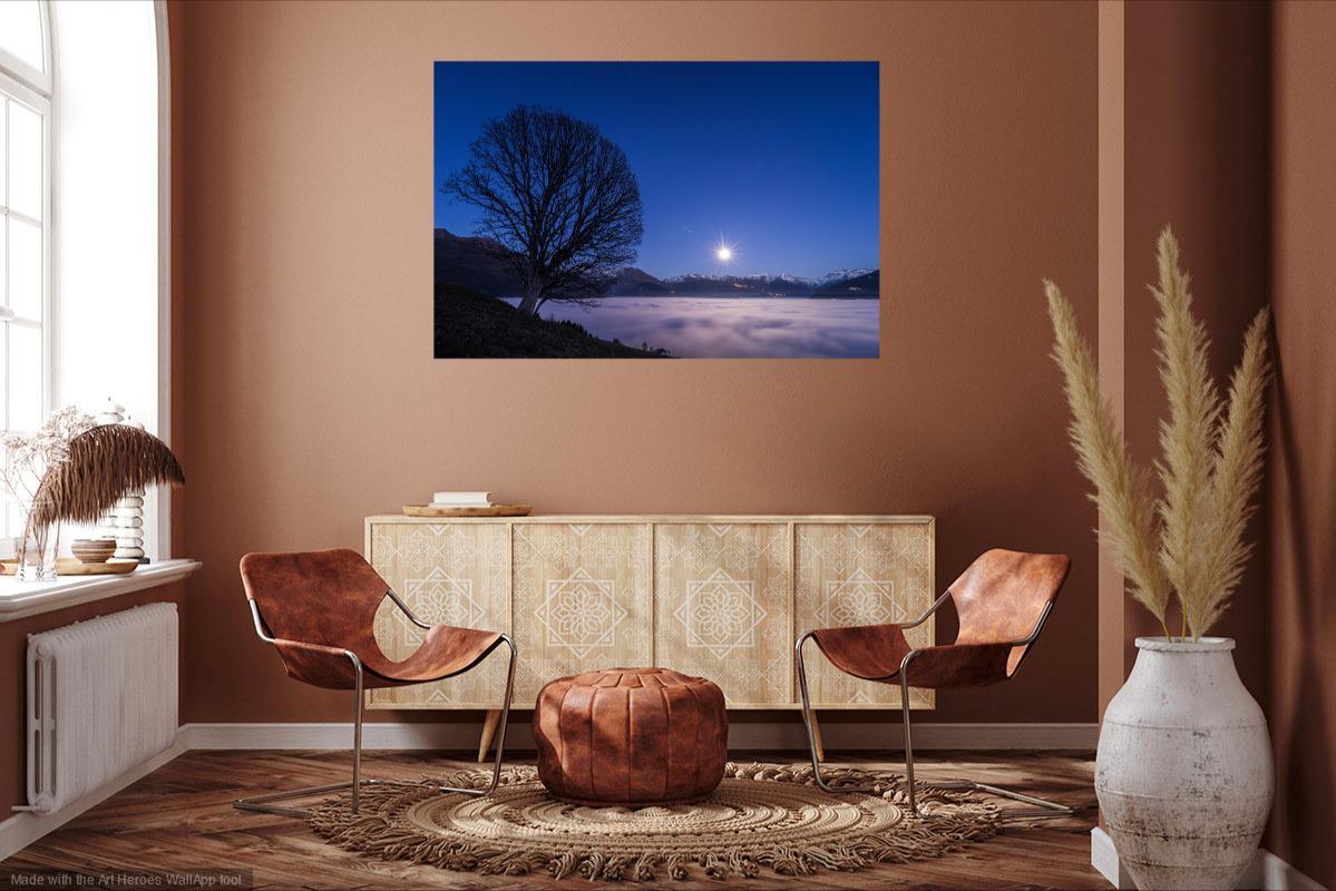 « La lune se rêvait soleil » est une photo de la série « Maurice l’érable » que j’ai réalisée en 2020 après le coucher du soleil sur les hauteurs de Bourg Saint Maurice (Savoie).